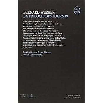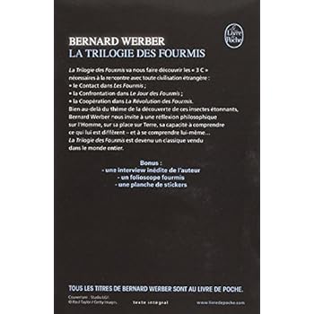 Nous ne sommes pas seuls sur Terre.A côté de nous, à nos pieds, entre nos maisons, vit une autre civilisation.Les fourmis.Elles étaient sur Terre bien avant nous. Il y a plus de 100 millions d’années, alors que nos plus lointains ancêtres ne sont apparus qu’il y a 3 millions d’années.Elles ont su, au cours des siècles, développer leur propre technologie, leur propre agriculture, leur propre architecture, leur propre politique. Mais nous les méprisons juste à cause de leur taille.Un savant génial, le professeur Edmond Wells, a décidé enfin de susciter la rencontre. Le dialogue peut commencer malgré les méfiances et les peurs.Avec le souffle d’une saga aux décors d’autant plus hallucinants qu’ils sont vrais, avec la complexité d’un monde d’autant plus extraordinaire qu’il existe réellement à côté de nous, nous sommes emportés dans les aventures de la fourmi 103 683e.La Trilogie des Fourmis va nous faire découvrir les 3 «C» nécessaires à la rencontre avec toute civilisation étrangère :-premier volume (Les Fourmis) : le Contact ;-deuxième volume (Le Jour des Fourmis) : la Confrontation ;-troisième volume (La Révolution des Fourmis) : la Coopération.Mais, bien au-delà du thème de la découverte de ces insectes étonnants, Bernard Werber nous invite à une réflexion philosophique sur la place de l’Homme sur Terre, sur sa capacité à comprendre ce qui lui est différent, – et à se comprendre lui-même…